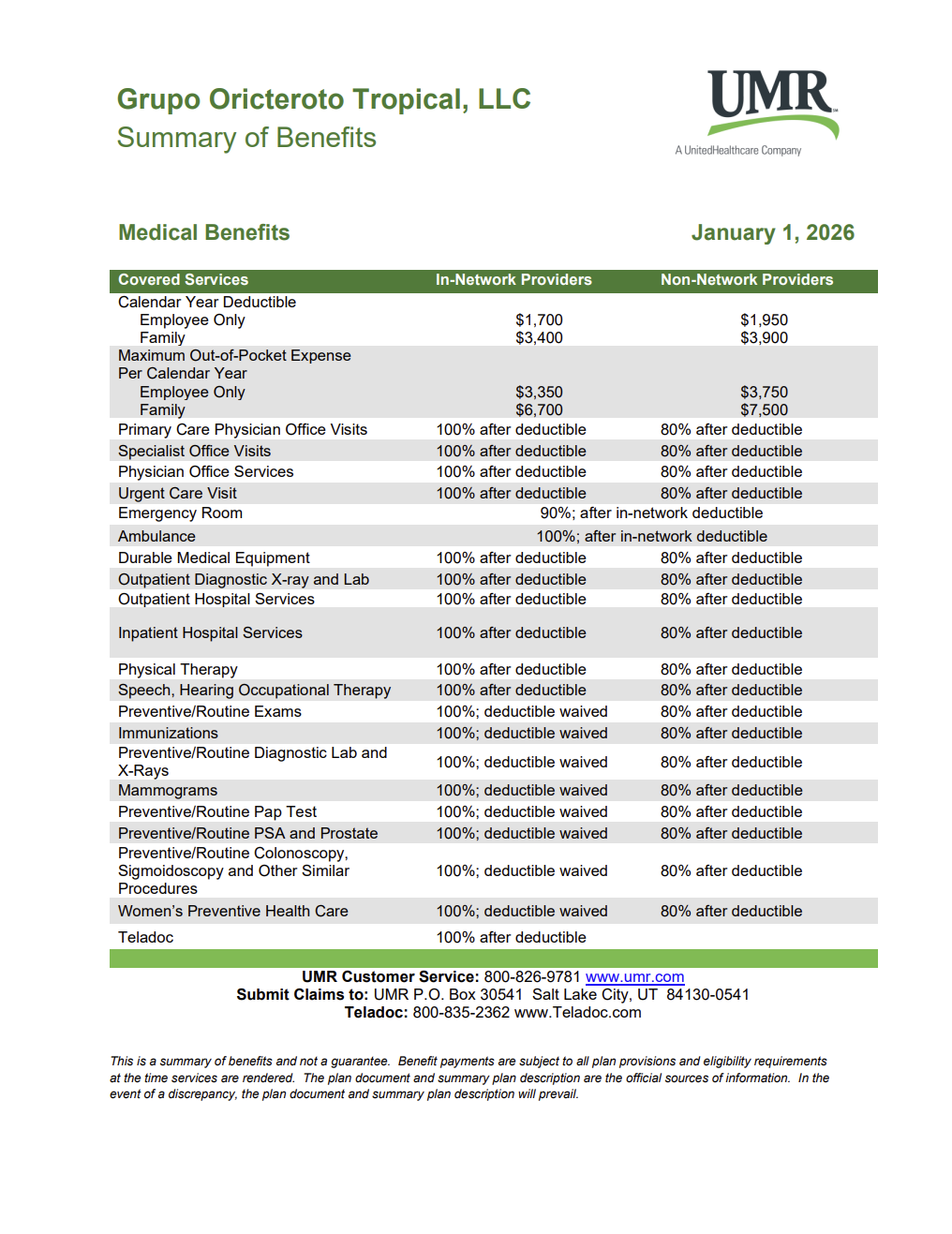 TMG offers health insurance coverage options through United Medical Resources. Plan Highlights are below.